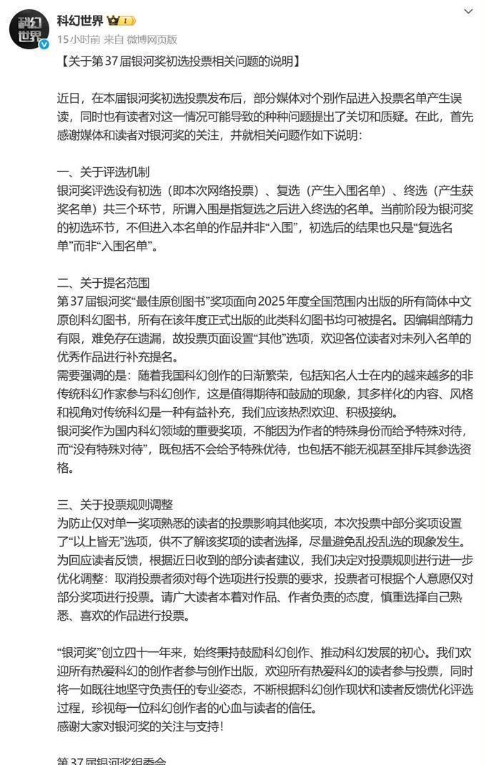 据我们所知,银河奖被普遍认为是中国科幻界的最高荣誉,其价值非常之高。邓紫棋身为一位跨领域的作家,她的首部作品就被选中,这不只是她的幸运,更多地体现了她的才华。在邓紫棋发表的评论部分,满是祝贺的声音。粉丝们真心地为她感到自豪和快乐,按照网友们的评价,她的表现实在是太出色了。出乎所有人的预料,邓紫棋在庆祝自己的作品被选中时,竟然出现了来自官方的情节反转。1月5日,账户科幻世界发布了一项声明,这一声明直接挑战了邓紫棋的立场。事实证明,邓紫棋并未被提名为银河奖的成员。