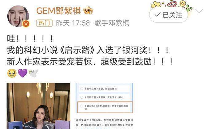 邓紫棋兴奋地宣布,她的小说已经被提名为银河奖的候选作品,作为新加入的成员,她感到非常荣幸和鼓舞。坦率地说,作为一名新加入的成员,能够被选中已经是相当令人高兴的事情了。