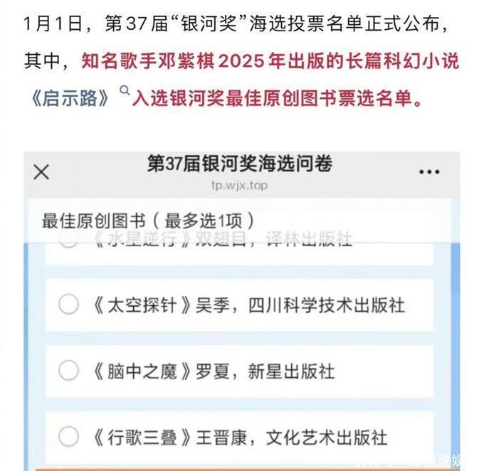 到了2025年4月2日,邓紫棋正式宣布自己为签约作者,并在那一年,她的第一部长篇科幻作品《启示录》被正式推向市场。据我们所知,预售的第一天,销售额已经触及4000w,这是一个令人欣喜的数字。最近,邓紫棋方发布了一则令人振奋的消息,她在自己的社交媒体平台上大张旗鼓地宣布,她的小说《启示录》已经被提名为银河奖的候选作品。